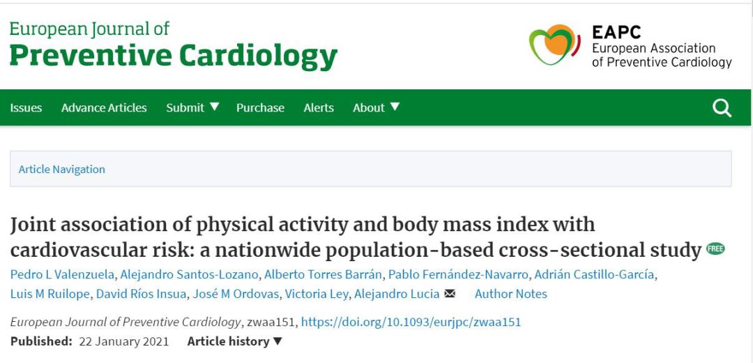 话说至此,也许有些月半子已经开始下决心制定减肥计划,还有一些人仍心存侥幸,虽体型肥胖,但是自认为平时有足够的运动量,疾病不会找上咱。此前,确实有一些研究证据表明,高心肺功能(CRF)可能可以减轻体重超标对心脏代谢健康的不利影响,因而提出“健康的胖子”这一理论。这让月半子们内心燃起了希望的火花,客官别走,看完下面这个最新研究结果再下结论不迟。为了澄清“健康的胖子”是否真的健康这一理论的准确性,欧洲大学的专家开展了一项大型观察性研究,分别评估了不同体重指数(BMI)和体育运动水平与主要CVD风险因素之间的联合关系。结果发表在欧洲心脏病学会(ESC)旗下期刊《欧洲预防心脏病学杂志》(European Journal of Preventive Cardiology)上。