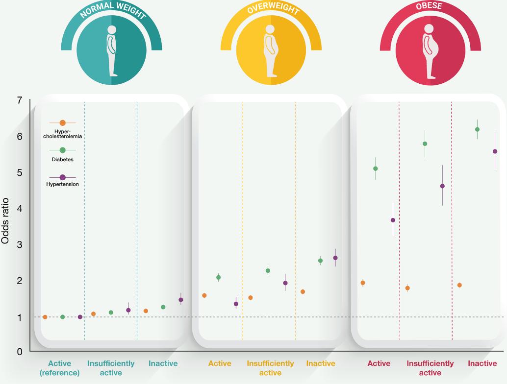 Joint association of physical activity and body mass index with cardiovascular risk: a nationwide population-based cross-sectional study. European Journal of Preventive Cardiology (2021), DOI: https://doi.org/10.1093/eurjpc/zwaa151研究结果显示,运动可以减轻超重/肥胖对CVD风险的不利影响,但过重的体重本身与主要风险因素的患病率显著增加有关。与体重正常的不运动参与者相比,“灵活的胖子”,即运动但肥胖的个体患高胆固醇血症、高血压和糖尿病的几率分别高出约2倍、5倍和4倍。