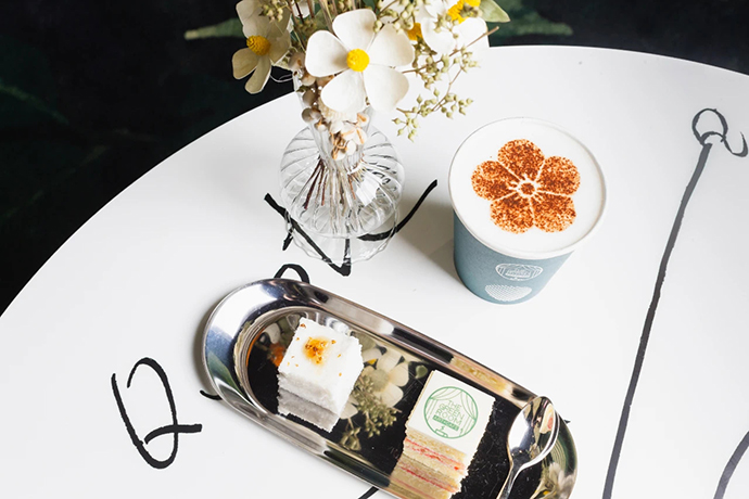 昆曲《浮生六记》演出期间,咖啡馆还上市了“浮生六记”甜·茶套餐,内含歌剧院蛋糕+桂花糕+红茶拿铁——两道甜点一冷一热,西式的歌剧院蛋糕松软清新,中式的桂花糕馥郁绵密;一杯红茶拿铁,茶香、奶香调和,入口回甘,拿铁上盛放着一朵梅花,巧克力粉凝成,赏心悦目。