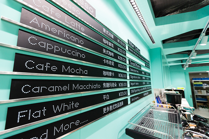 咖啡馆的墙面也别出心裁,一面墙上挂着化妆镜,镜子四周镶嵌着白色的泡泡灯——这是大剧院化妆间里最经典的摆设,另一面墙上挂着黑色餐牌,各色饮品的英文字母和售价也是用泡泡灯“写”出来的。
