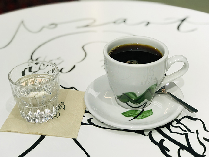 咖啡馆里摆着8张圆桌,桌面上的图案由艺术家手绘,来自耳熟能详的歌剧、芭蕾、音乐剧和音乐家们,譬如《图兰朵》《阿依达》《天鹅湖》《剧院魅影》,以及莫扎特、帕瓦罗蒂——这和大剧院综合性的演出定位一脉相承。和圆桌配套的椅子也有两款手绘图案,设计元素分别采自大剧院的舞台幕布、红色座椅。