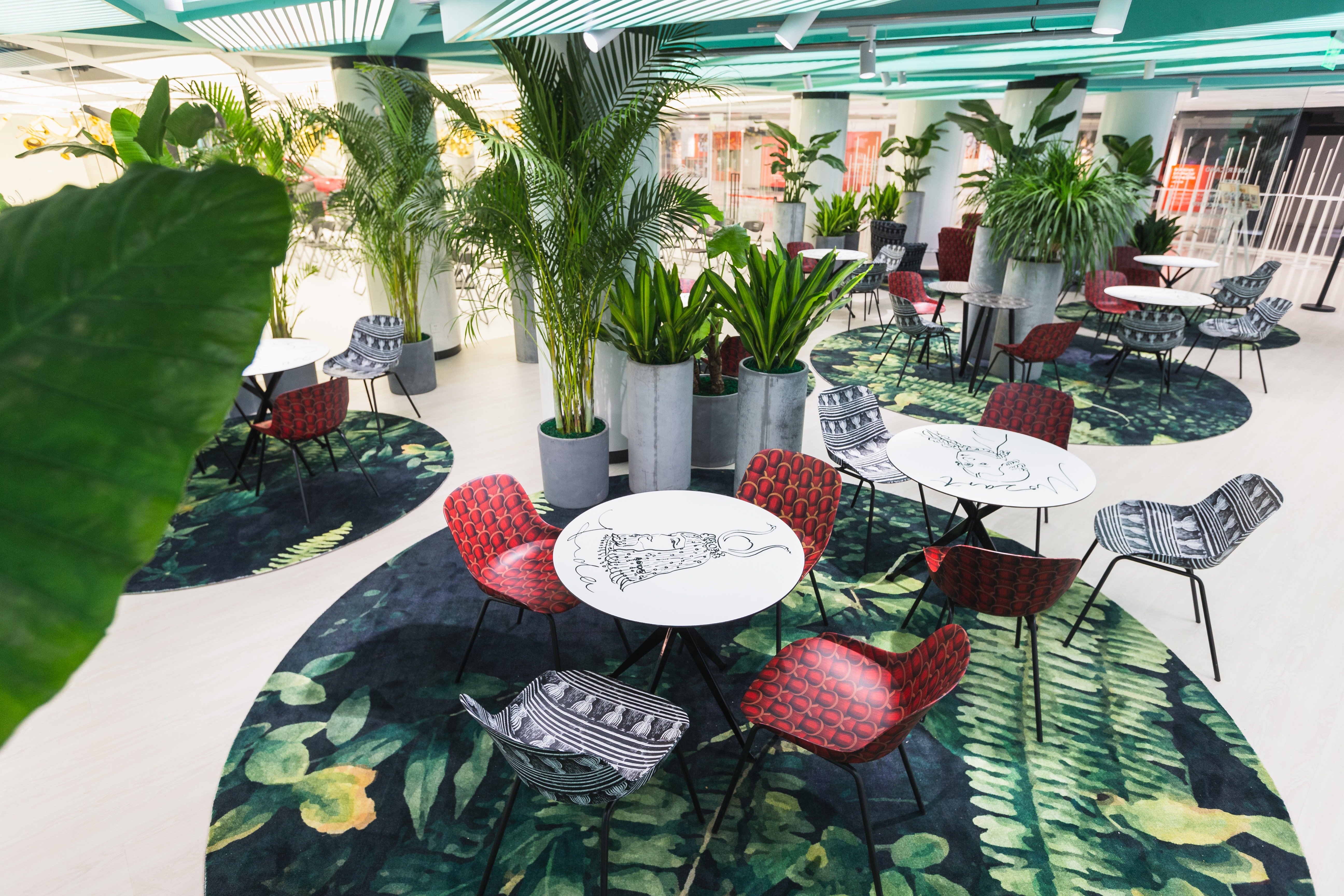去年4月,随着剧院复工,咖啡馆开始启动翻新重装工程:首先敲掉天花,露出管道,抬高了层高;主色调采用了近两年的潮流大色——薄荷绿,同时呼应了咖啡馆的名字;咖啡馆里错落摆放着散尾葵、金心巴西铁、鹤望兰、滴水莲等高大的绿植,地面铺着圆形的绿色印花地毯,原本空旷的空间瞬间灵动了,客人的私密性也得到了保证。