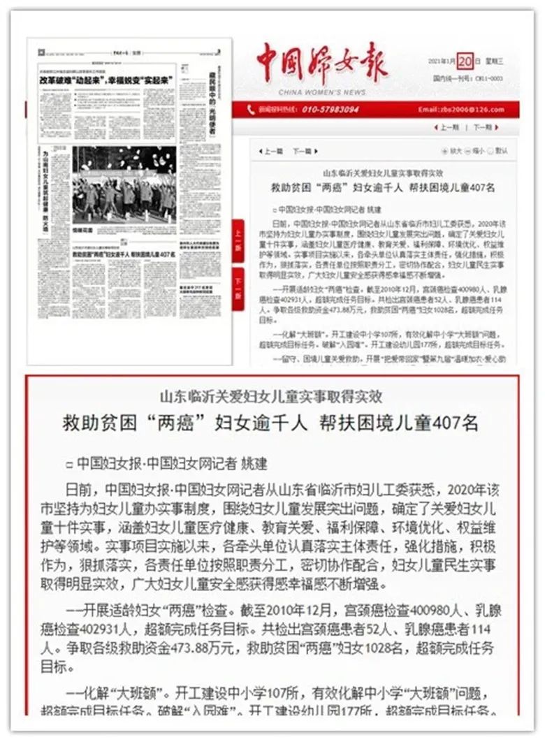 去年以来,全市各级妇联组织与中国人寿临沂分公司各分支机构周密部署、分工协作、相互配合,多形式、多举措推进妇女健康保险工作,家庭安康工程实现新突破,2020年全市共计承保妇女20.1万人,额度达到128.5亿元,全年理赔达到1920人次,赔付金额1111.5万元,解决了妇女群众因特殊疾病造成的实际困难,成为一项实实在在的惠民工程,得到了广大妇女群众的一致称赞。市妇联、中国人寿保险临沂分公司、市扶贫办联合开展“关爱女性 健康扶贫”捐赠保险活动,为全市9个县区268个省定贫困村的4164名贫困妇女、莒南县坪上镇116名建档立卡贫困妇女捐赠了保费20.8万元、保额1.25亿元的“关爱母亲健康扶贫”专项保险;为1783名脱贫享受政策人员捐赠了保费3.56万元、保额1355万元的意外伤害医疗保险。开展适龄妇女“两癌”免费检查,检查妇女40.3万余名,全市各级妇联争取“两癌”救助专项资金488.38万元,救助贫困“两癌”妇女1128名。今年1月20日,中国妇女报头版头条、中国妇联新闻网分别报道了我市“两癌”检查和救助等关爱妇女儿童十件实事实施情况。