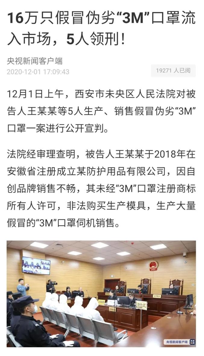 16万只假冒伪劣“3M”口罩流入市场,5人领刑!