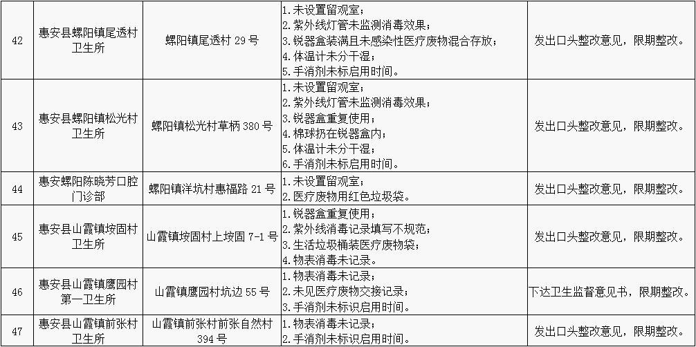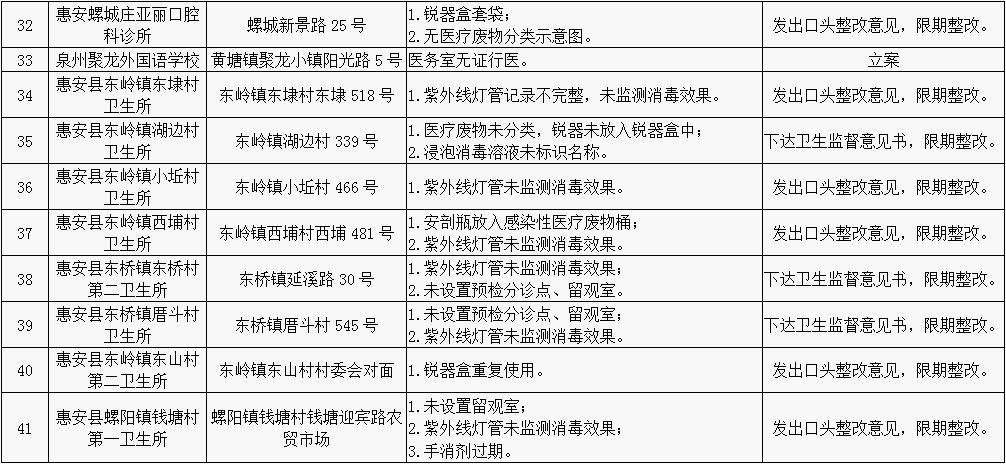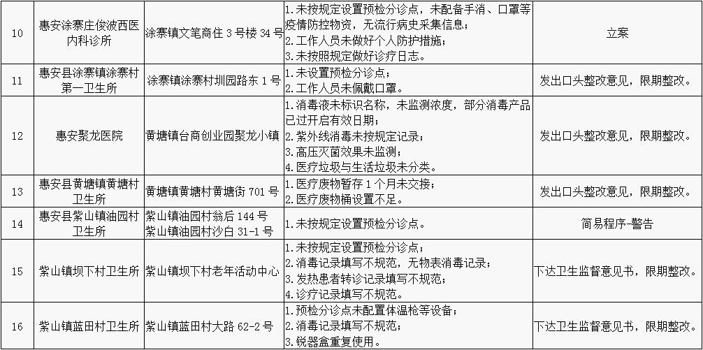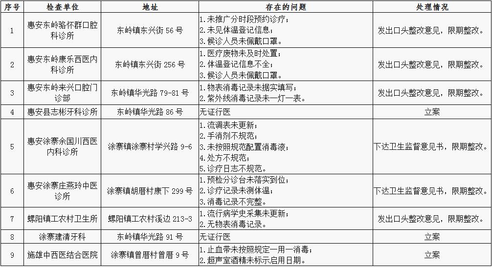 自1月18日以来,惠安县卫生健康综合执法大队累计检查各级各类医疗机构56家,其中立案5家,发出卫生监督警告3家,发出整改意见38家(其中下达监督意见书22份),停业整顿1家。