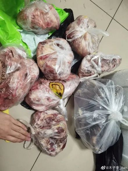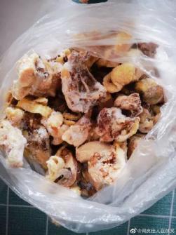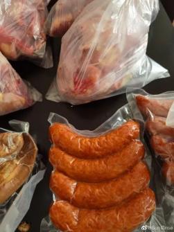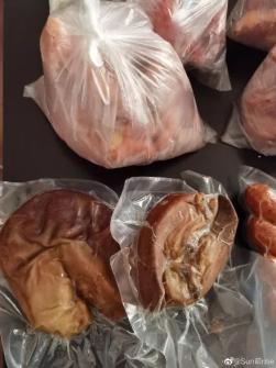 ►@Sun萌rise今天收到了来自我老母亲的爱:两只剁好的小笨鸡儿,两包红肠,一个松仁小肚,一包口条,一包肚儿,另外还有炖小鸡用的碎成渣渣的野生蘑菇……