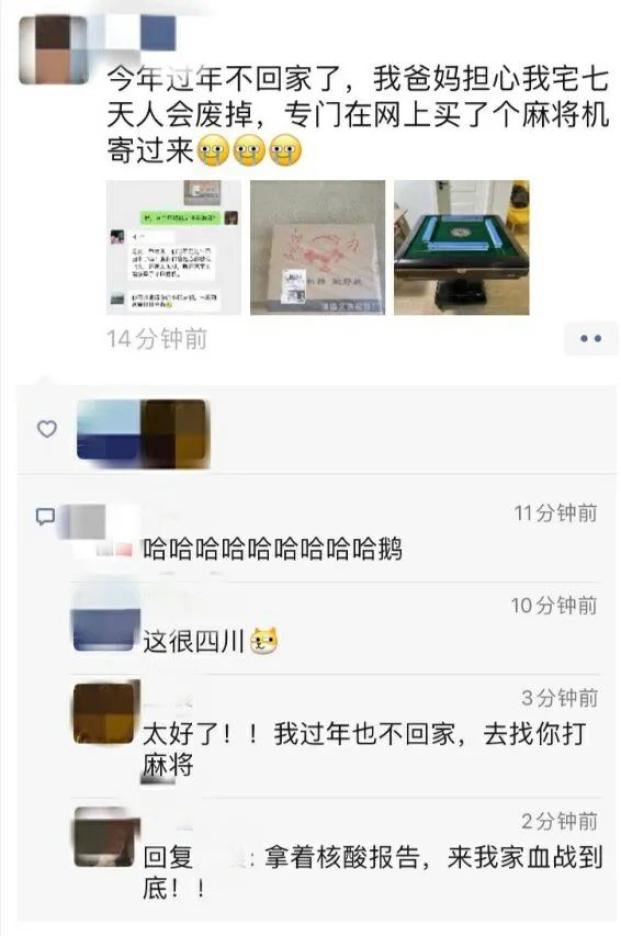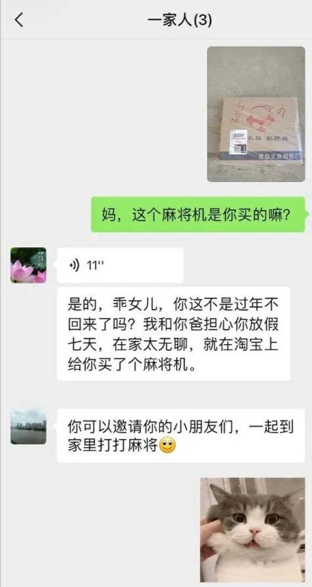 朋友成都的,因为疫情今年留在杭州过年,没想到她爸妈担心她一个人在家太宅了,居然给买了麻!将!机!
