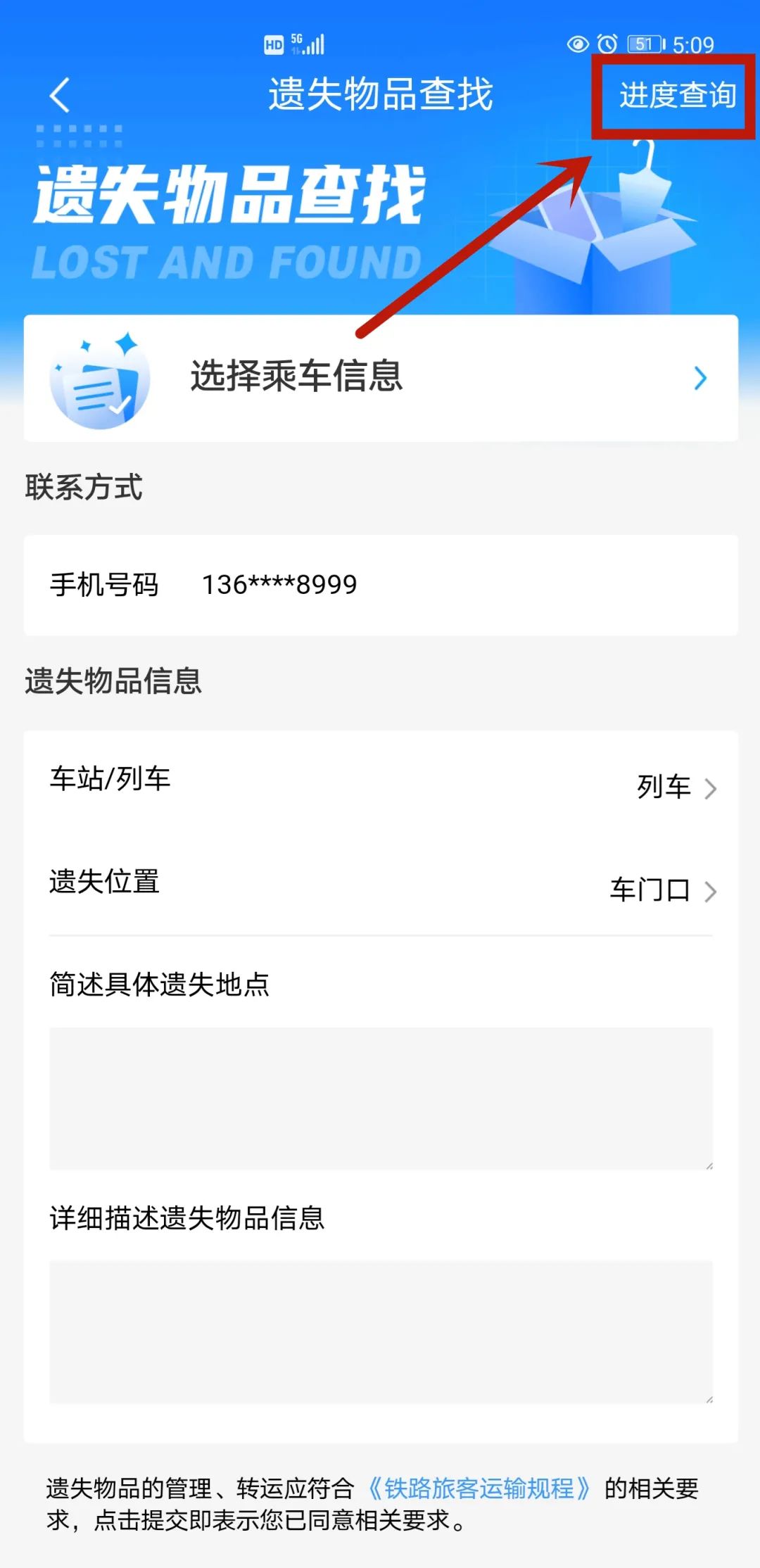在报失界面选择您乘车信息并认真填写遗失物品信息(物品信息要尽可能详细哦,这样工作人员才能帮你迅速找寻)。