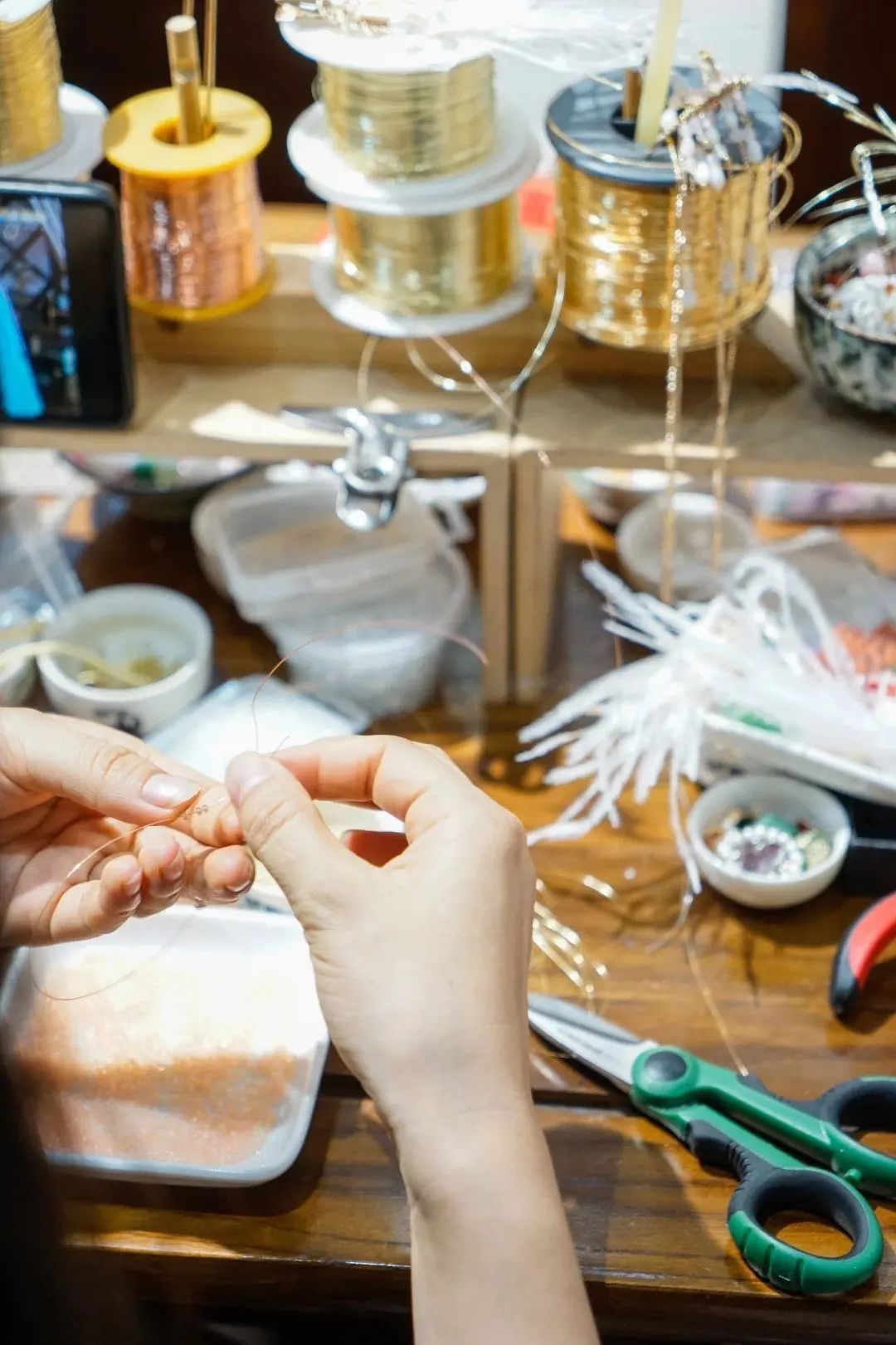 店里,相约而行来试妆的汉服小姐姐先是逛了一会,选出一款心仪的头饰,再化上一面精致妆容,随后拿起手机拍出一张心满意足的美照才肯作罢。还有一些身着汉服的手作爱好者,在这里DIY发饰,汉服店里会提供齐全的材料,小姐妹们一边手作一边分享着自己的汉服情结。