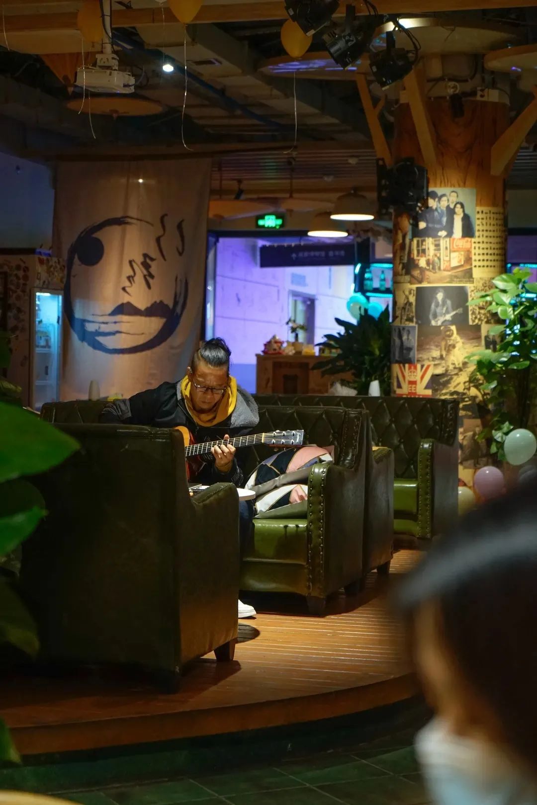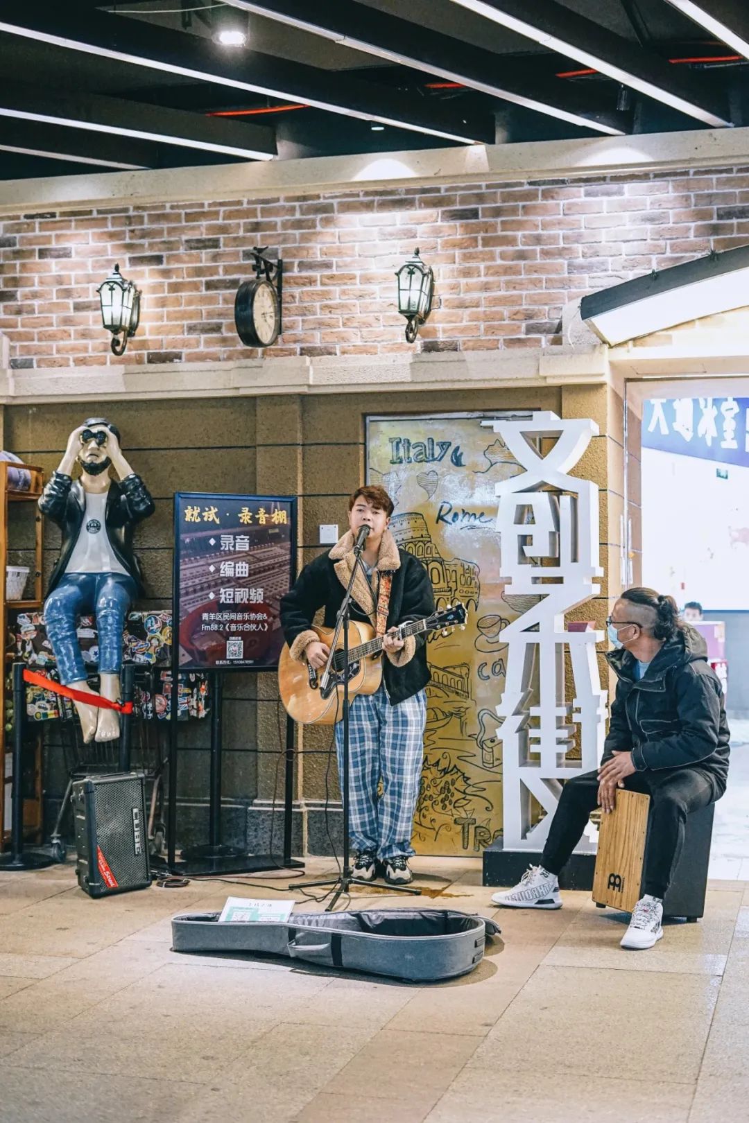 除了这样的音乐形式,3/4车站文创艺术街区入口处也是一群音乐人的“舞台”。演奏者会随性的选一首歌,无论有没有听众,声音也一直高昂。音乐爱好者享受着他们的舞台,在吉他、手鼓、旋律下······我们只管做一位忠实的听众就好。