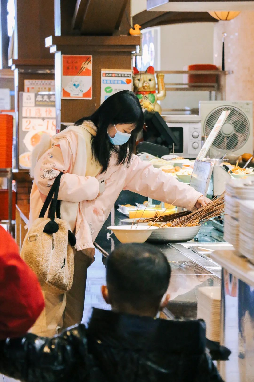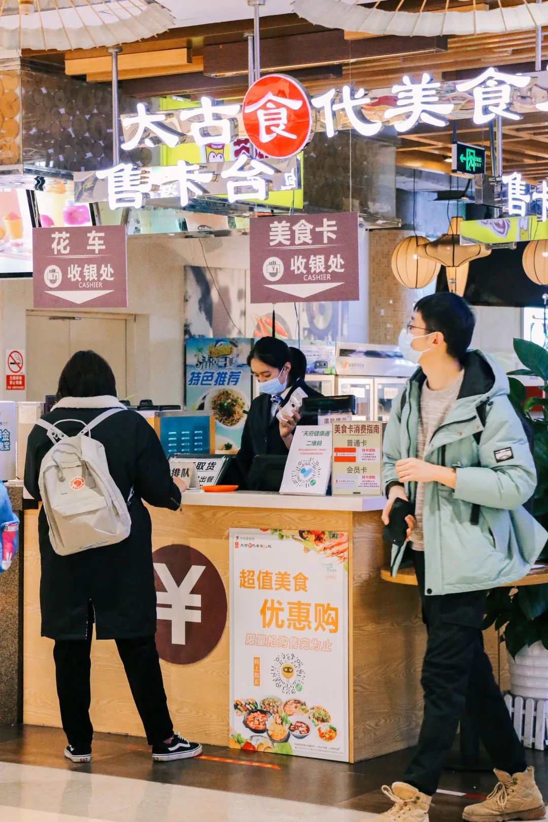 冬日下午六点半,成都的天已经暗了下来,天府广场上只见零零散散的人,而此时的天府今站文化广场正热闹。来来往往的人或被商场外摆区的美食吸引,或被商家的吆喝声招揽,不自觉地在这里逛起来。