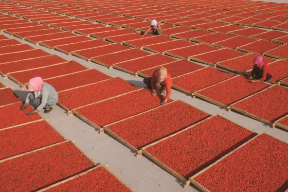 同心县枸杞种植基地务工群众在晾晒枸杞同心县