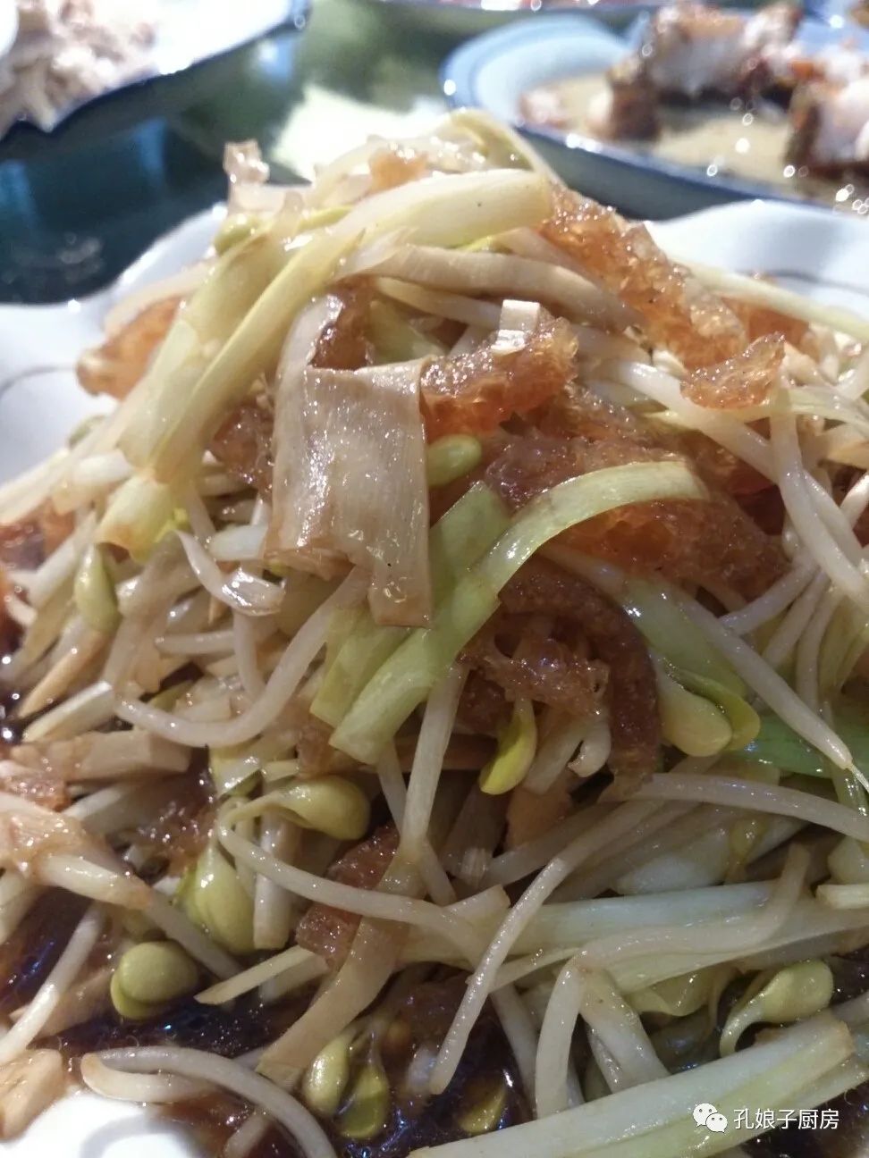 待到八冷盘、六热炒一一上完,我妈妈系上饭单进厨房,不一会儿功夫就端上一盆菜。定睛一看,金边细瓷浅碟上是一堆雪白透明的长条,每条顶端连着椭圆形金黄色豆瓣,原来是黄豆芽。过年,黄豆芽不能叫黄豆芽,要叫“如意菜”!如意两字,标准上海话读音为“是意”,因为黄豆芽的模样儿活脱慈禧太后最喜欢的玉如意。那么这盆“脱苦如意菜”中脱苦是什么?塌棵谐音脱苦,冬天下霜后口感鲜美的塌棵菜,洗净切碎炒在黄豆芽里面,翠绿色点缀雪白嫩黄,和谐美好。就这样,大吉大利的春节,黄豆芽龙登宝座讨得口彩。这个菜的做法是宁波籍外婆家传下来的,据说过年吃此吉祥如意菜已在江南民间流传了上百年。年夜饭吃几筷黄豆芽炒塌菜,便能脱掉去年所受的种种苦难,换来明年一年的称心如意,寓意贴心,附加值太高。