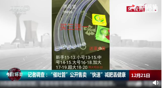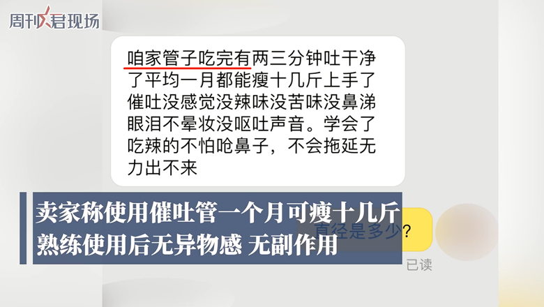 卖家声称,使用时,消费者需要将催吐管插进胃里50cm,使食物顺着管子吐出来,两三分钟就可吐干净,平均一个月可瘦十几斤。而且使用无异物感,相对手动催吐无副作用。
