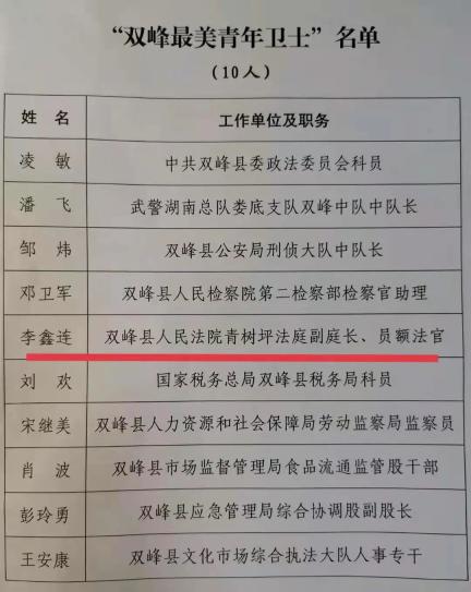 近日,在双峰县委政法委、团县委等13家单位联合开展的“双峰最美青年卫士”评选活动中,我院青树坪法庭副庭长李鑫连被评为“双峰最美青年卫士”。