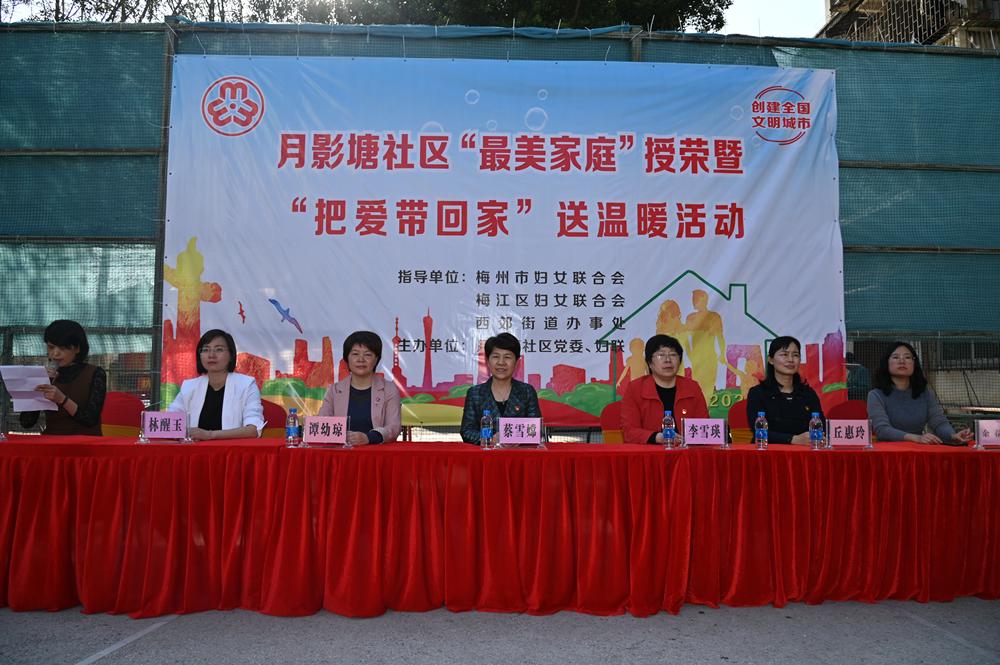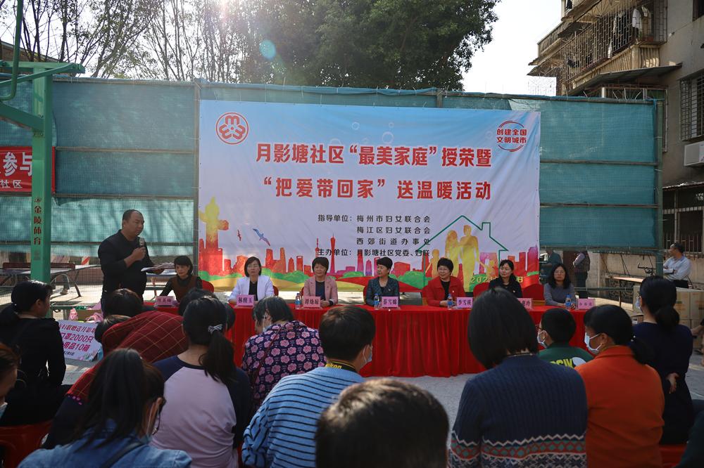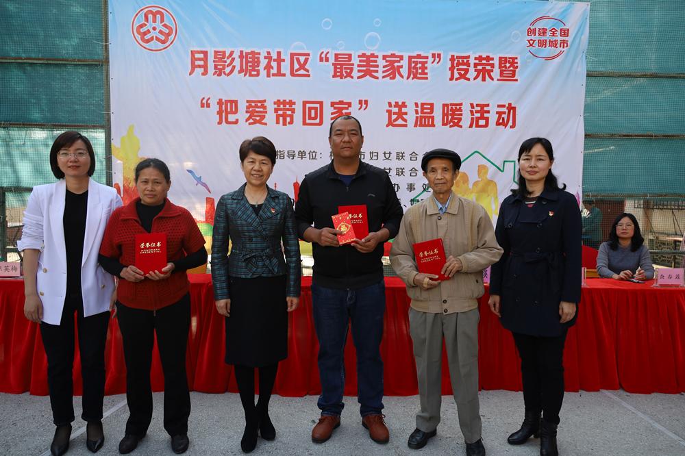 在月影塘社区“最美家庭”授荣仪式上,市妇联蔡雪嫦主席、梅江区妇联丘惠玲主席、西郊街道党工委林醒玉副书记为三户2020年度月影塘社区“最美家庭”颁发了奖金和荣誉证书。