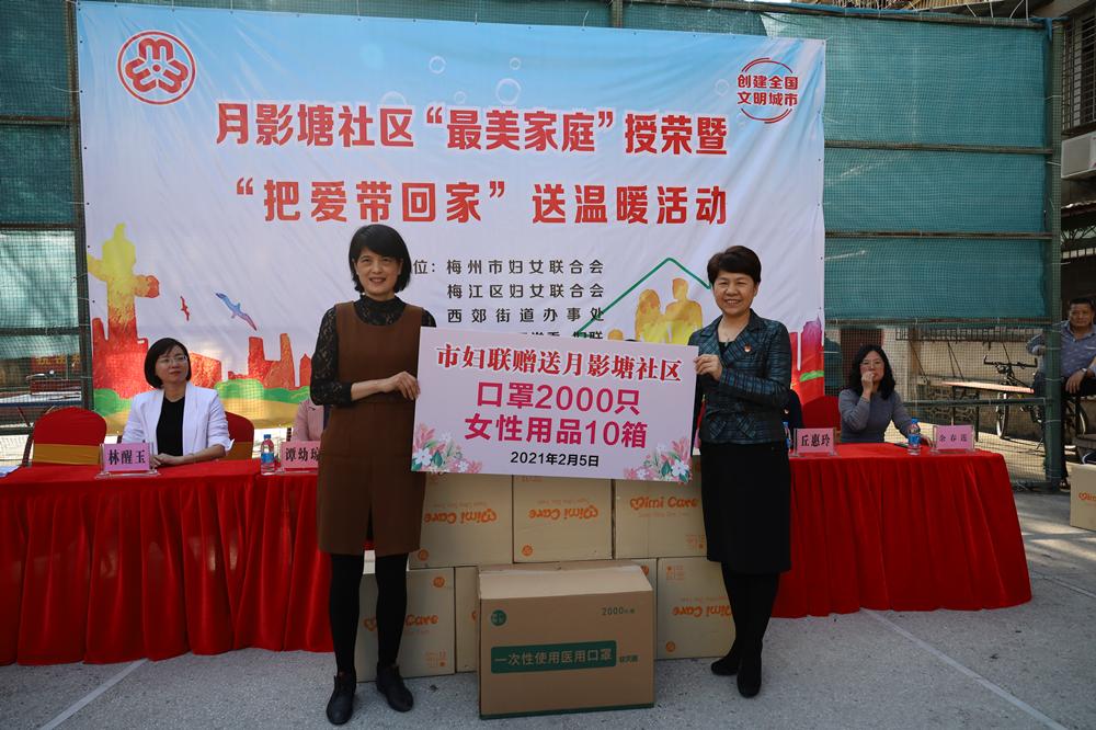 活动现场,市妇联蔡雪嫦主席向月影塘社区赠送了成人、儿童口罩各1000只和女性用品一批。