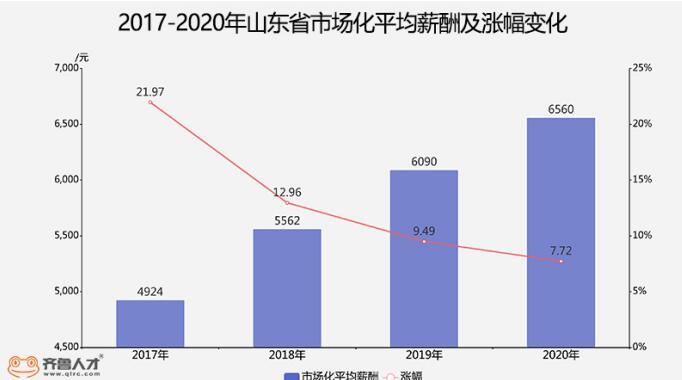 从2017-2020年山东省市场化平均薪酬及涨幅变化来看,山东省市场化平均薪酬呈平稳上涨趋势。2017年市场化平均薪酬为4924元;2018年涨幅达12.96%,市场化平均薪酬为5562元;2019年涨幅为9.49%,市场化平均薪酬为6090元;2020年涨幅为7.72%,市场化平均薪酬为6560元。