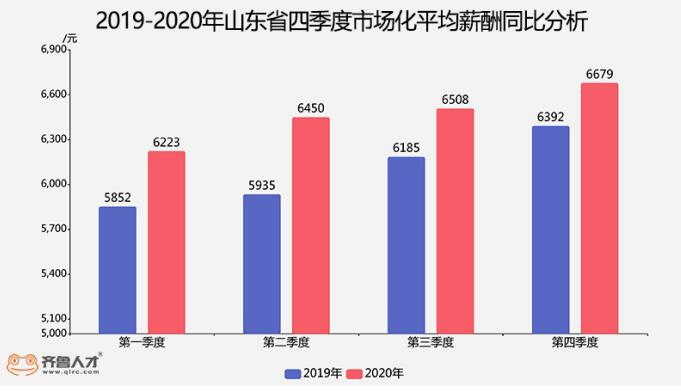 从上图走势来看,疫情给山东带来的冲击通过一季度市场化平均薪酬直观反映出来,一季度山东省市场化平均薪酬全年最低,为6223元;二季度薪酬为6450元,上涨明显;三四季度薪酬分别为6508元和6679元依旧持上涨态势。就薪酬涨幅来看,2020年二季度创季度最高涨幅,薪酬同比2019年同期上涨515元。