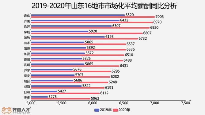 根据2019-2020年山东16地市市场化平均薪酬同比分析来看,青岛以7005元蝉联榜首;济南紧随其后,以6970元位列第二;临沂以6920元排在全省第三位;聊城市6807元排在第四位;第五位是潍坊市,薪酬为6732元。2020年山东省仅有1座城市平均薪酬低于6000元,突破6000元的城市较2019年增加11座。威海和滨州两市薪酬涨幅较小,较2019年排名有明显下降;其他城市薪酬排名变化不大。