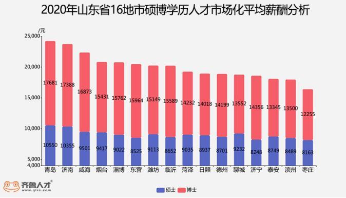 从2020年山东省16地市硕博学历人才市场化平均薪酬来看,“济青”两地硕博学历人才平均薪酬均领先其他城市。