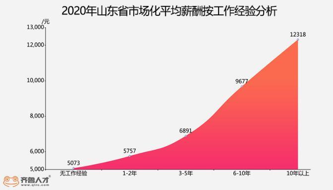 由2020年山东省提供给不同工作经验求职者的市场化平均薪酬可以看出,无工作经验的求职者市场化平均薪酬5073元垫底,较拥有1-2年工作经验的求职者市场化平均薪酬低684元;拥有10年以上工作经验求职者市场化平均薪酬高达12318元,比拥有6-10年工作经验求职者薪酬高2641元。综合趋势来看,薪酬与工作经验呈正相关,过硬的专业技能,丰富的工作经验等优势,成为职场中获取高薪的主要手段。