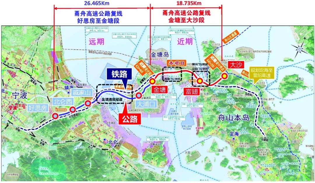 此次获批的金塘至大沙段工程为先行实施工程,路线长18.735公里,按双向六车道高速公路标准建设,设计速度100公里/小时,沿线设置金塘枢纽、富翅枢纽及终点收费站。