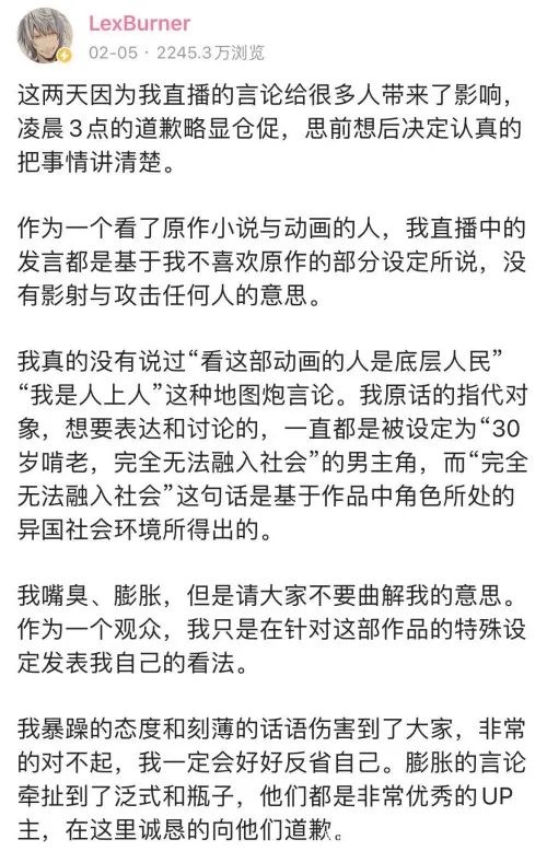 LexBurner是B站百大up主之一,以动漫、游戏实况吐槽见长,粉丝数原本高达900多万,但直播事件导致他遭到大面积“脱粉”。