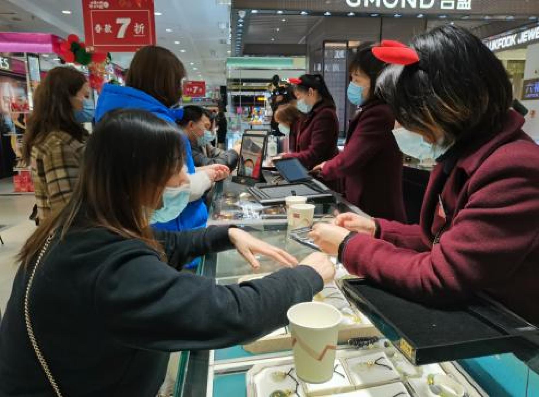 “今年给自己买一个金手镯,算是奖励给自己的,因为2020年自己很努力。”一位女性消费者开心地说道。商场耐克服装专柜的副店长唐基华告诉记者,今年比去年同期的营业额增加了一倍,主要是因为一些大学生留在长沙过年,再加上商场春装的折扣力度比往年都大,最低到了6折。