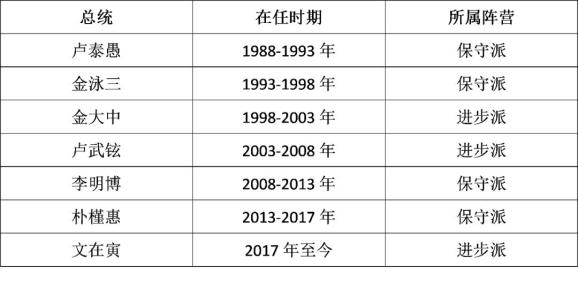 自20世纪80年代末韩国实现政治民主化以来,韩国国内进步与保守两大政治阵营分裂、对立明显。两派势力交替入主青瓦台,竞争激烈。