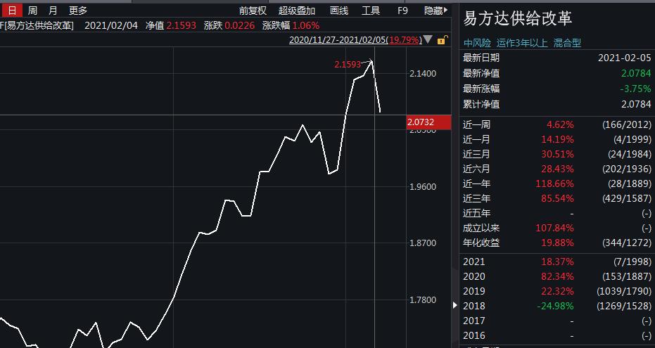 而2021年的新年市场中,在许多基金的净值收益新年后纷纷回撤下跌之际,易方达供给改革基金新年开年一个多月收益率接近20%,截至2021年2月7日,该基金在全部1万多只基金中排名第23名。