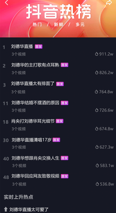 刘德华入驻抖音,48小时粉丝数便突破4000万,登上明星爱DOU榜第一,同时斩获52个全网热点,总曝光量达到23.9亿,为《人潮汹涌》赢得了更高的曝光与市场关注度。