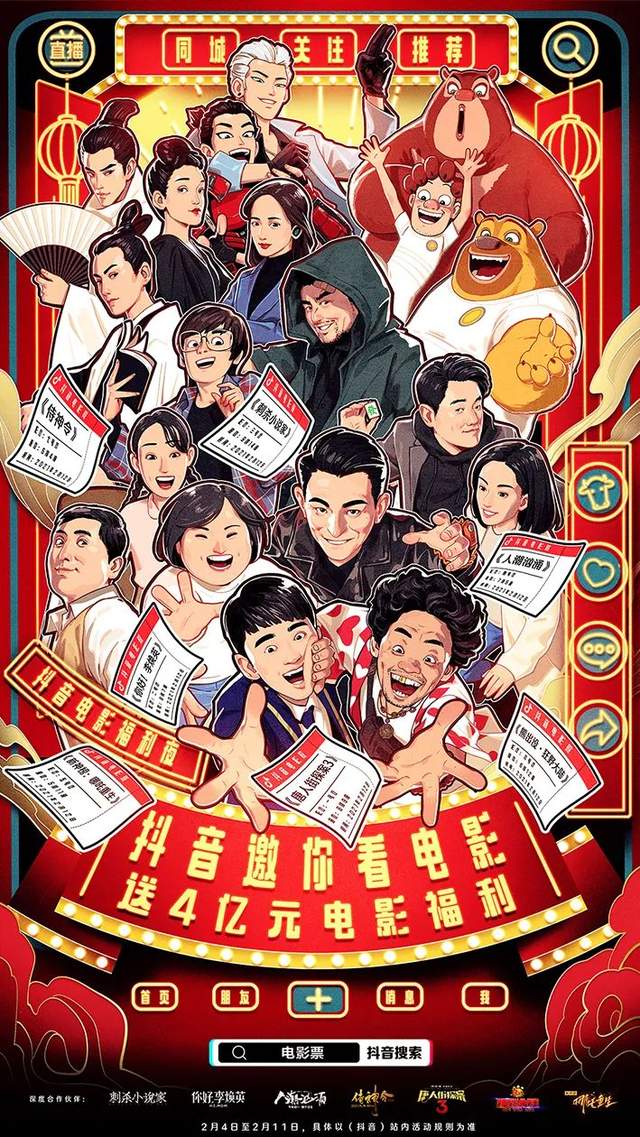 片方的统一选择与营销战略的变化,使得抖音作为影视宣传主阵地的重要性不断凸显。而在这个时间节点,抖音又顺势推出了4亿元电影福利活动,与“抖音明星电影福利夜”直播同步进行。7部院线电影、17位明星及2位动画⻆⾊组成史上最强明星阵容,助抖⾳送出4亿电影票,2月4日起,上抖音搜索“电影票”进入活动专区,和朋友组队就有机会领取电影票、代金券,获得4亿电影福利。