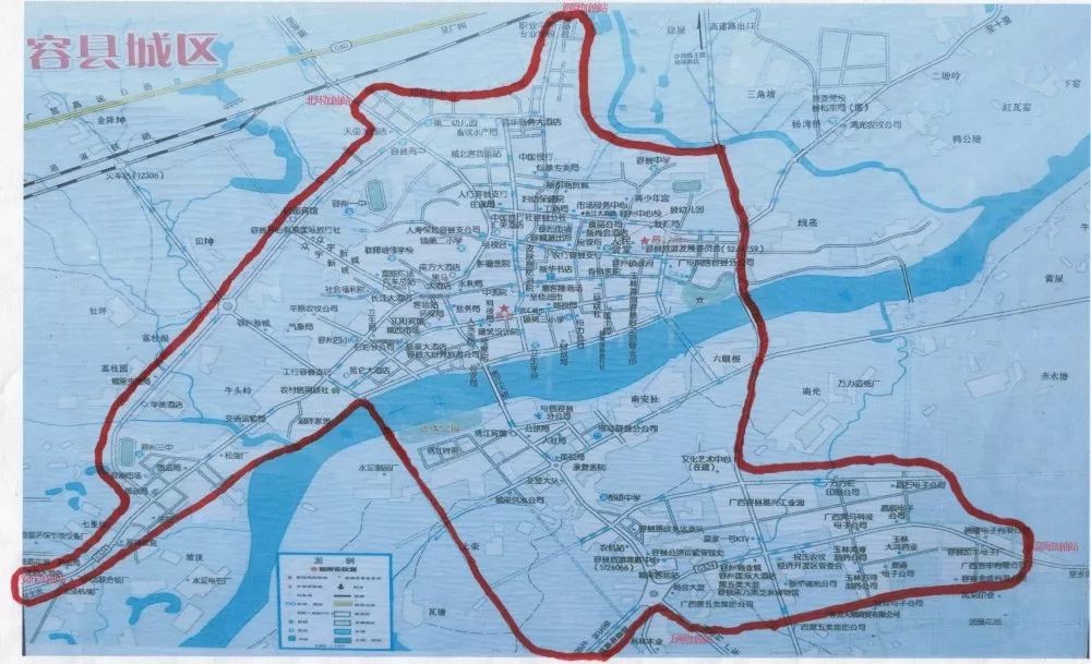 (注:本图所示禁放区域及《容县禁止烟花爆竹燃放管理规定》第七条规定的其他11类场所和区域全时段禁止燃放烟花爆竹。)