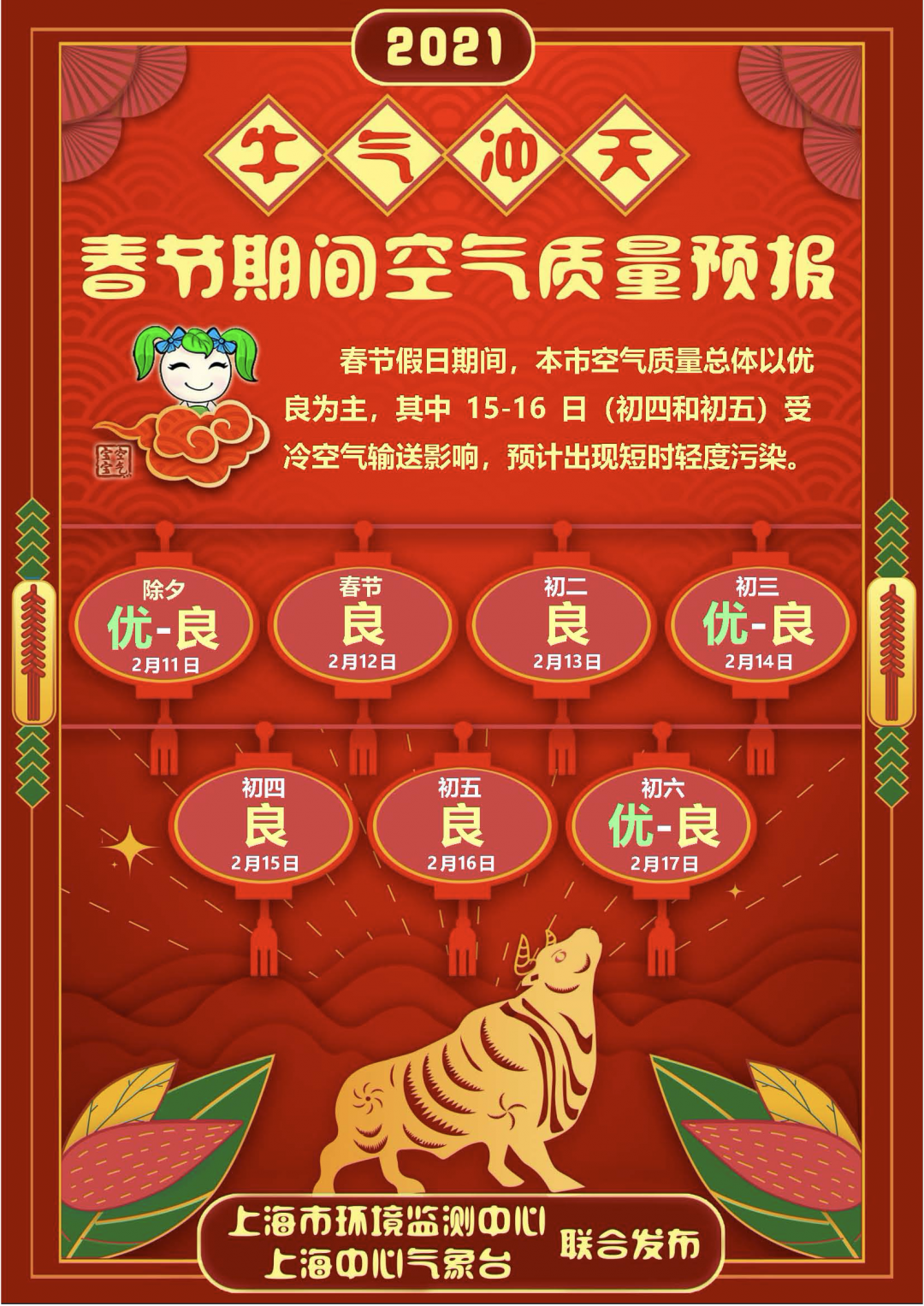 据上海发布2月9日消息,经上海市生态环境、气象部门会商,春节假日期间,上海市空气质量总体以优良为主,其中2月15-16日(初四和初五)受冷空气输送影响,预计出现短时轻度污染。