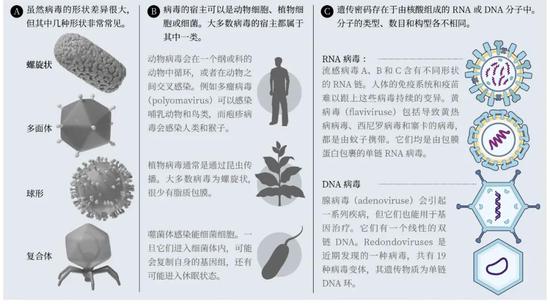 什么是病毒?病毒是一种极其微小的颗粒,由蛋白质外壳和其内部RNA链或DNA链组成。它们只能在宿主细胞的帮助下进行复制。病毒可以根据以下3种方式进行鉴定:形状(A)、宿主(B)和遗传物质(C)。