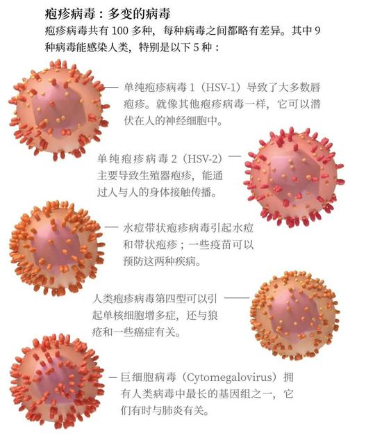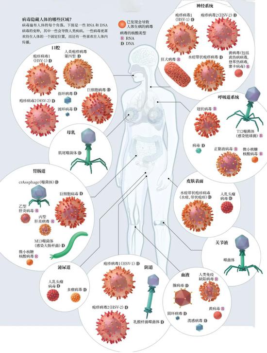 人类的病毒组 我们的身体里充满了来来去去以及能在人体内待上数年的病毒。一些病毒科如疱疹病毒科,可引起多种疾病。