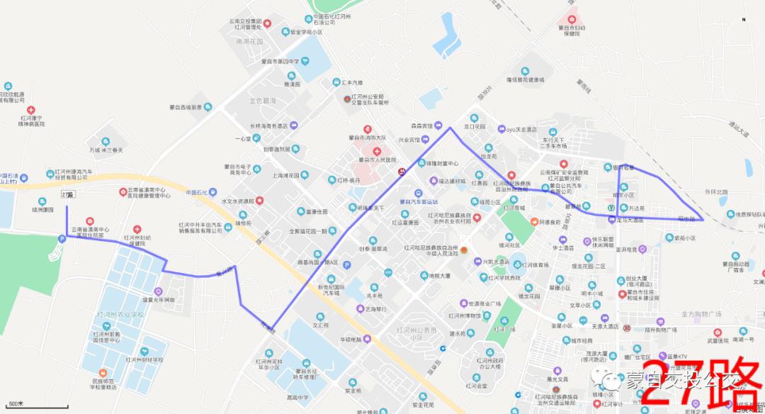 红河官房大酒店→毓秀路蒙自二中→军分区→瀛洲河畔→红河映象→鸿运花园→世纪花园→农垦小区→红大酒店→市文体局→海虹人家→文萃路州行政中心→翠康小区→红河肛肠医院→洪盛小区→富康大厦→隆信雅苑→蒙自市妇幼保健院→姜家寨→蒙自市妇幼保健院→北京路西湖1901→龙口花园→富康大厦→洪盛小区→红河肝肠医院→翠康小区→文翠路州行政中心→海虹人家→市文体局→红大酒店→农垦小区→锦华路农垦小区→朝阳路君悦天下→红河映像→瀛洲河畔→红河官房大酒店