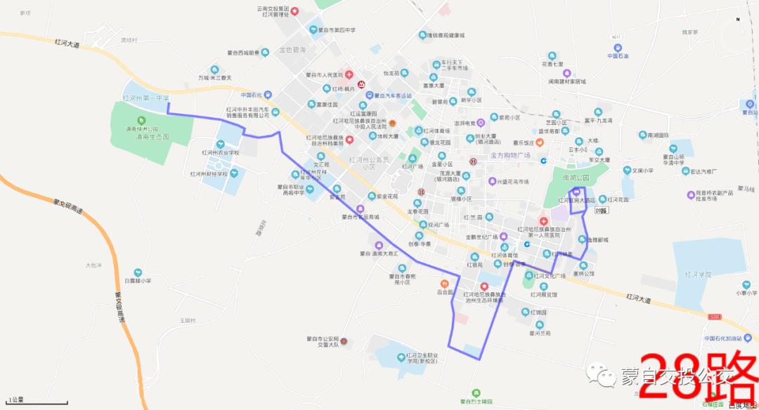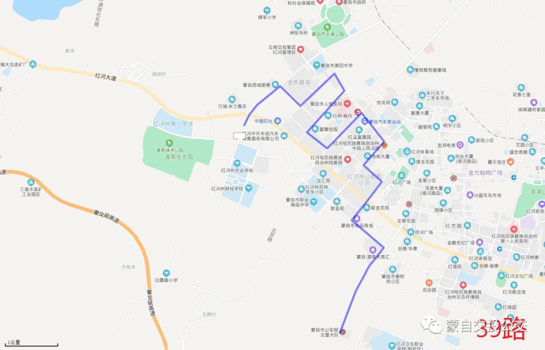 州一中东门→滇南绿洲→滇南中心医院南门→职教园区→蒙自市陪护敬老院→桂湖天宇→蒙自一中→凤凰小学→湖光雅苑→滇南大商汇会→民生小区→市中医院→团结小学→红寨→红河电视台→红河大道五大中心→景观河小区→朝阳路景观河小区→育才路1号站→军分区→红河官房大酒店→毓秀路蒙自二中→育才路1号站→华泰盛景→学海路1号站→红河大道五大中心→青少年活动中心→红寨→团结小学→市中医院→阳光小苑→民生小区→滇南大商汇→湖光雅苑→蒙自一中→观澜路1号→蒙自市陪护敬老院→红福苑→滇南中心医院南门→滇南绿洲→州一中东门