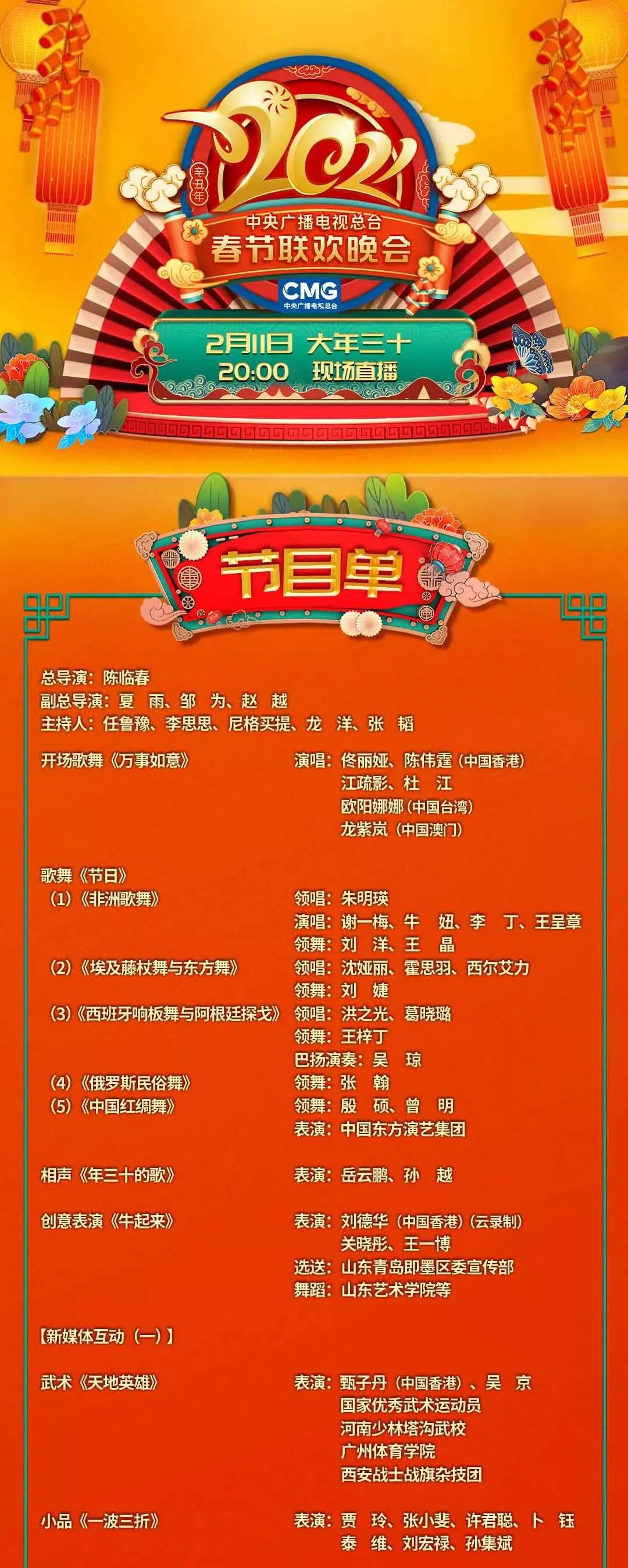 “万民安康辞鼠年,欢歌笑语迎牛年”。中央广播电视总台《2021年春节联欢晚会》将于2月11日除夕与观众见面。今天,春晚节目单新鲜出炉,全部节目正式公布。