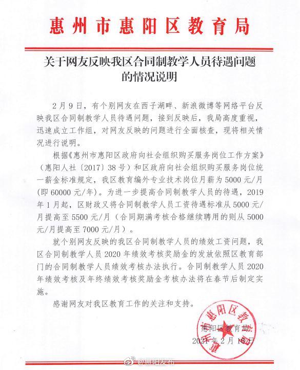 2月10日,惠阳区委宣传部官方微博@惠阳发布 刊发了《关于网友反映我区合同制教学人员待遇问题的情况说明》。该情况说明称,“2月9日,有个别网友在西子湖畔、新浪微博等网络平台反映我区合同制教学人员待遇问题,接到反映后,我局高度重视,迅速成立工作组,对网友反映的问题进行全面核查,现将相关情况进行说明。”
