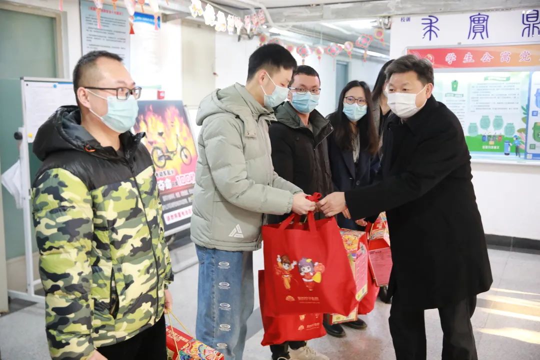 在学生公寓,校领导关心询问留校学生在校生活状况,亲手送上留校大礼包并表达新春祝福。在校学生纷纷表示感谢学校各项举措让同学们在校如在家、温暖过大年。