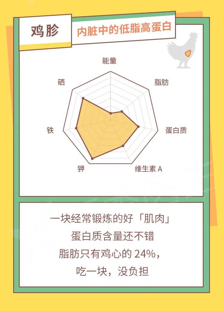 鸡心、鸡血、鸡胗、鸡肝都属于动物内脏,中国居民膳食指南建议每月吃 2~3 次,每次吃 25 克左右。25 克有多少?差不多巴掌大小的鸡肝,切下一元硬币厚的这么一片就差不多啦。这个量真的很少,所以不妨几种内脏轮换着吃,这周吃这种,下周吃另外一种。