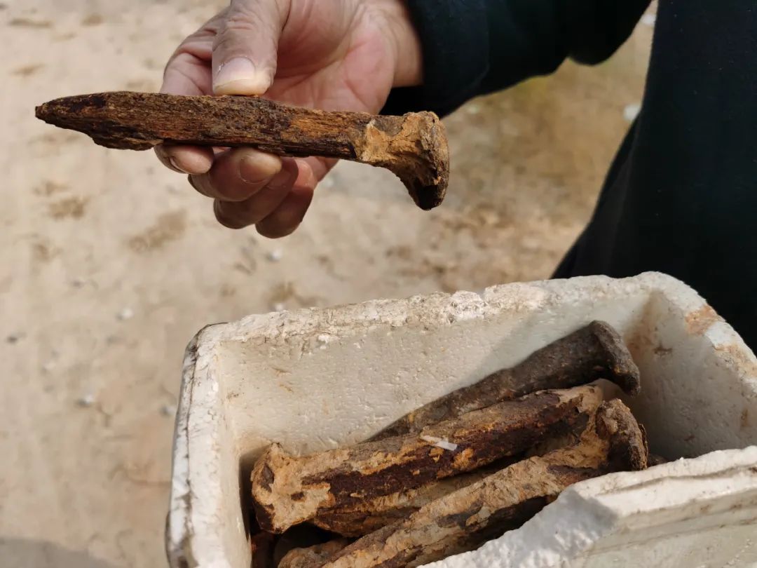 在潭江牛湾段的江堤上,牛湾火车码头遗址仍依稀可寻,标定轮渡火车的航道铁链早已沉入江底,无迹可寻,但遗址码头的田地里仍能找到一些轨道、铆钉等遗物。当地村民王姐家的鱼塘在牛湾火车码头附近,王姐展示了几枚当年轨道用的铆钉,铆钉长短不一,长的大约15厘米,小的不足巴掌大,但都早已锈迹斑斑。