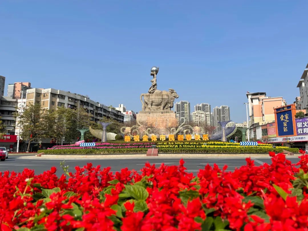 张奕维 殷浩轩摄牛雕是每个新会人都十分熟悉的一个地标建筑,其形象是一位少女骑在耕牛背上,托举着珍珠。牛雕名叫“再造辉煌”。耕牛寓意新会人民辛勤劳动,少女寓意青春活力、一切美好;手托珠,寓意成就辉煌,也寓意新会人民开拓、创新、团结、奉献。