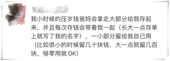 父母保管型②:开户、买车,压岁钱都存着呢也有些网友说,孩子的压岁钱都是父母帮忙保管,从银行开户到长大以后买车......这些钱都好好地存着。