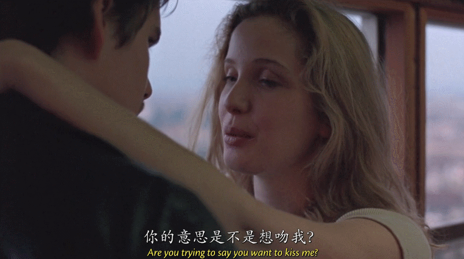 而在此之前,Céline和Jesse曾置身一家唱片店的狭小试听室里,听着浪漫歌曲,眼神互相试探、游戏,暧昧也随音乐蔓延。他们都想亲吻对方,最终却什么都没有发生。