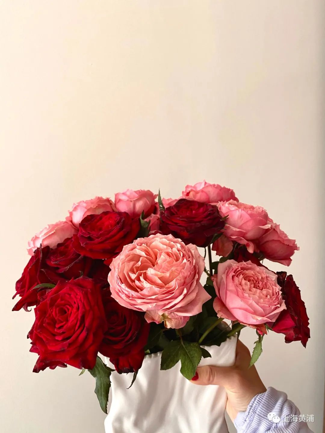 Tips:所有鲜切花到手第一步醒花,深水高筒放置鲜花两三个小时,花头萎靡或者夏天炎热需更久一点。吸水后等到花瓣肉眼可见变硬挺就可以拿出来了;第二步45度角斜剪根,摘除多余叶子,留一到两片。去刺,最后高水位装瓶。