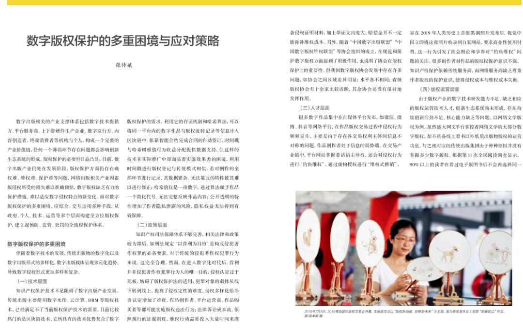数字出版相关的产业支撑体系包括数字技术提供方、平台服务商、上下游硬件生产企业、数字发行方、内容创造者、终端消费者等机构与个人,构成一个完整的产业价值链,任何一个薄弱环节存在问题都会影响创新生态系统的形成,版权保护的必要性日益凸显。目前,数字版权保护面临哪些难题?有何解决之策?