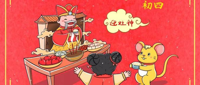 大年初四,是恭迎灶神的日子。“灶神”,也称灶王、灶君、灶王爷,中国古代神话传说中的司饮食之神。按照民间的说法,正月初四,灶王爷要点查户口,所以家家户户都要守在家里,准备丰富的果品,焚香点烛并燃放鞭炮,以示恭迎。